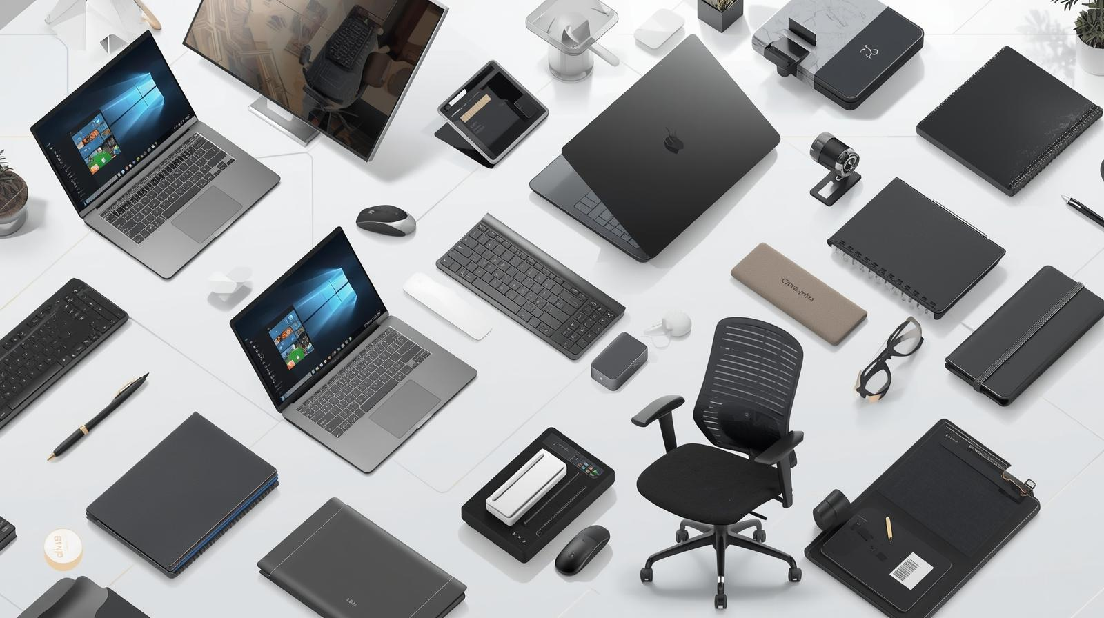 Laptops and office supplies for work-from-home.